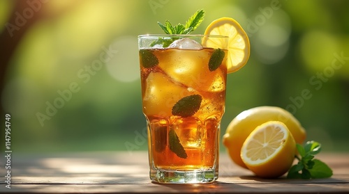 Refreshing Iced Tea with Lemon and Mint on a Sunny Day, Generative AI