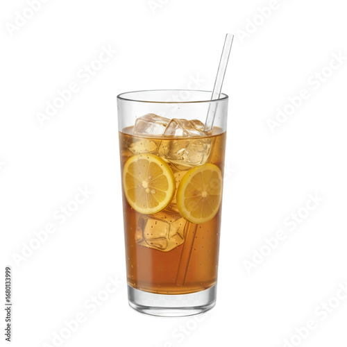 Refreshing iced tea with lemon slices and ice cubes, perfect for summer refreshment.