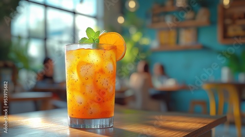 Refreshing Iced Tea with Mint and Orange Slice on a Wooden Table in a Bright, Cozy Café Setting