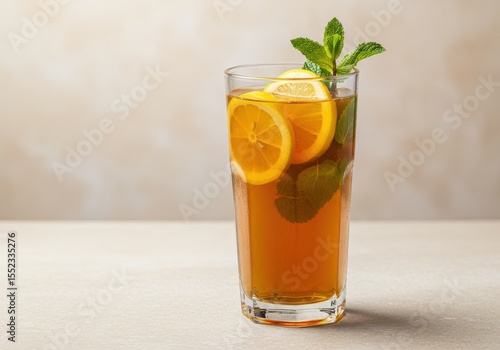Refreshing Iced Tea with Slices of Lemon and Fresh Mint Leaves in a Clear Glass on a Soft Background