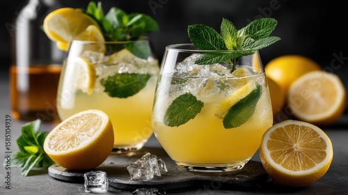 Refreshing lemon juice cocktail with mint leaves and lemon slices served on a dark gray background for a vibrant drink experience