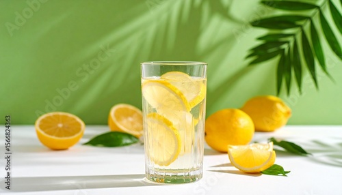 lemon, water, drink, beverage, glasses, slice, citrous, fruit, refreshing, healthy, detox, hydratation, natural, fresh, summer, tropical, shadow, light, sunlight, green background, table, still life, clean, bright, zest, cold, liquid, thirst, quench, healthy lifestyle, organic, diet, cleanse, juicy, sour, sweet, ingredient, preparation, closeup, studio shot, cool, cold drink, dieting, well-being, wellness