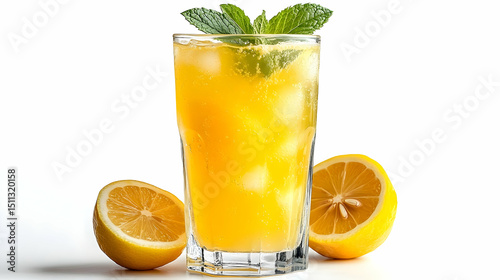 Refreshing lemonade with ice and mint garnish against white background
