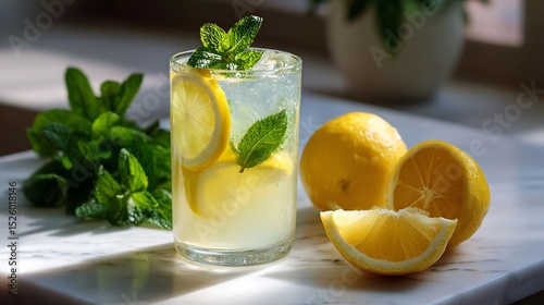 Refreshing Lemonade with Mint and Sliced Lemons on a Marble Surface