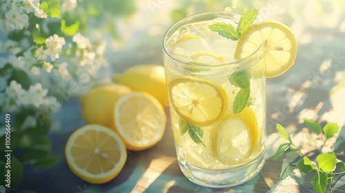 Refreshing lemonade with vibrant lemon slices and fresh mint leaves, perfect for cooling off on a hot summer day, evoking a sense of relaxation and enjoyment.