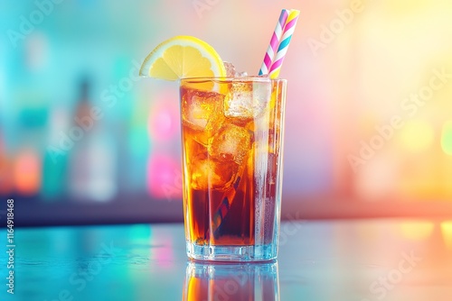 Refreshing Long Island Iced Tea in a slender highball glass, with fizzy cola and amber hues, garnished with a lemon wedge and striped straw, set against a modern minimalistic bar under cozy lighting.