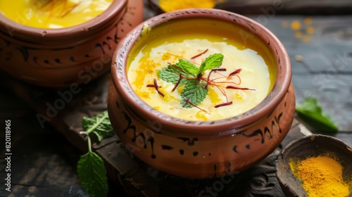 Refreshing mango lassi drink served in a traditional clay pot, garnished with saffron strands and mint leaves.