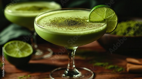 Refreshing Matcha Cocktail in Martini Glass with Lime Slice and Dusting of Green Powder