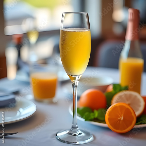 Refreshing Mimosa Drink with Orange Juice and Champagne, Breakfast Table Setting with Citrus Fruits.