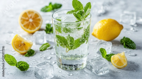 Refreshing Mint and Lemon Water on a Light Grey Surface