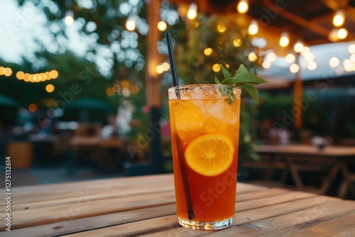 Refreshing orange cocktail on outdoor patio table with string lights backdrop