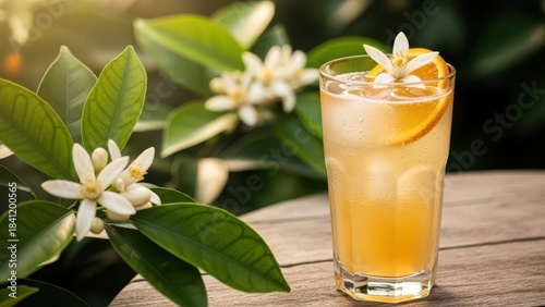 Refreshing Orange Drink With Ice And Flower Garnish On Wooden Table Outdoor Setting