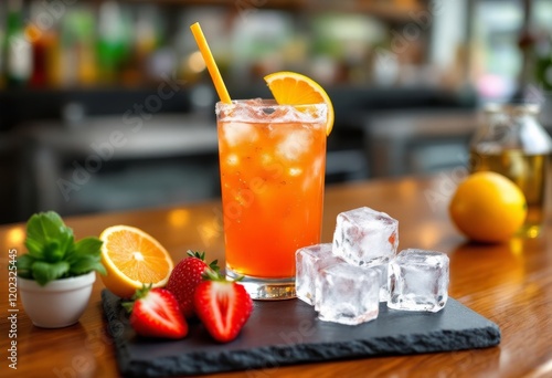 Refreshing orange tropical cocktail with citrus and straw placed on slate board with frozen strawberries and ice cubes.