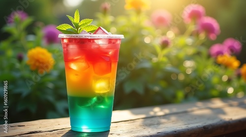 Refreshing Rainbow Layered Iced Drink with Mint Garnish on Wooden Table Outdoors in Summer Sunlight