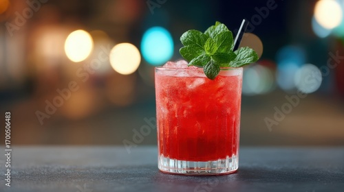 Refreshing Red Cocktail with Mint Leaf and Straw on Dark Surface with Blurry Background of Night Lights and Shadows in a Bar Setting