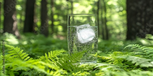 sparkling water, ice cube, glasses, water, forest, fern, nature, green, leaf, summer, drink, cold, refreshing, healthy, hydratation, plant, background, pure, clean, beverage, eco, environment, ecology, botanical, scenic, tranquil, serene, peaceful, fresh, vibrant, lush, foliage, wood, digital artwork, illustration