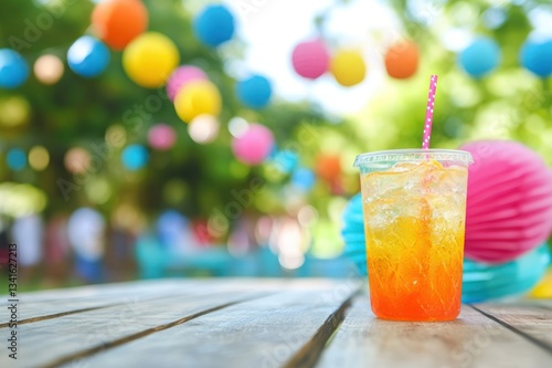 Refreshing Summer Drink in Clear Plastic Cup with Colorful Background of Festive Decorations