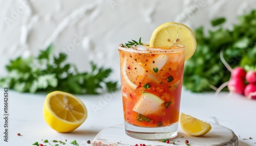 Refreshing Tangy Turnip Glass with Lemon Garnish and Fresh Herbs on a Light Background