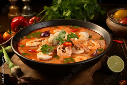 Refreshing Tom yam soup bowl. Shrimp food dish spicy chili. Generate Ai