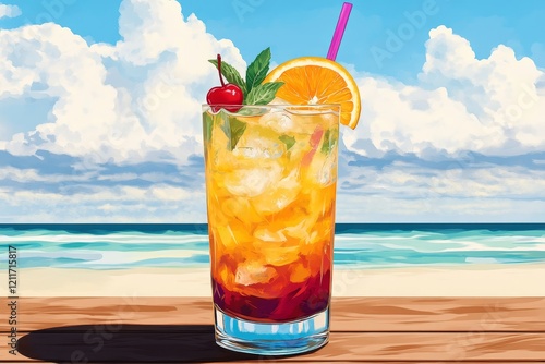 Refreshing tropical cocktail in tall glass with orange, cherry, and ice on beach.