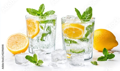 Refreshing Water Splash with Lemon Slices, Mint Leaves, and Ice Cubes on White Background,