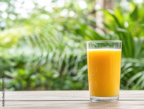 Refreshing yellow beverage in glass on wooden table with green background