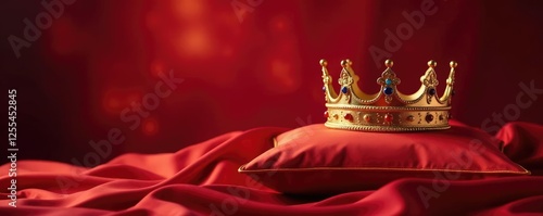 Regal golden crown rests on luxurious pillow against fiery crimson backdrop, richness, regalia