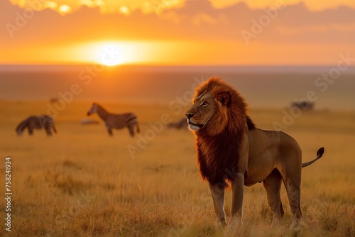Regal male lion stands proudly against a stunning savannah sunset, with zebras grazing in the background