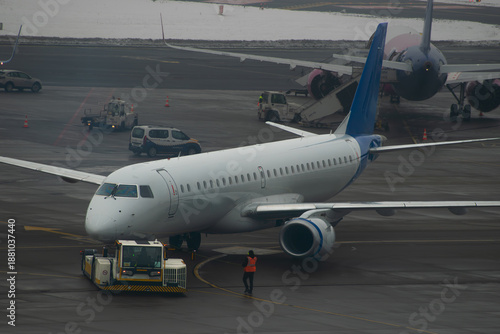 Regional passenger jet being pushed back from the airport gate on a foggy winter morning, ground crew and tug vehicles in action, preparing for taxi and departure on the airport apron