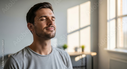 Relaxed Young Man Enjoying Mindfulness in a Sunlit Room with a Peaceful Expression