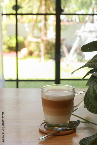 Relaxing composition of a green plant Beautiful green plant Silver Philodendron a cup of iced coffee beside a window. Bright and calm tone suitable for home lifestyle, work from home