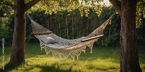 Relaxing in a hammock strung between two trees in a serene backyard during the golden hour of sunset