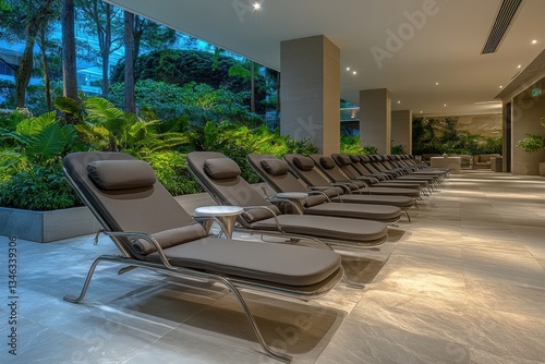 Relaxing lounge chairs line a tranquil outdoor space, nestled amongst lush greenery and offering a serene escape.