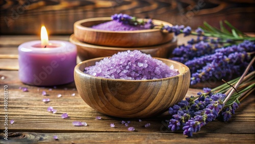 Relaxing Spa Scene Aromatic Lavender Salts, Wooden Bowls, and a Lit Candle on Rustic Wood