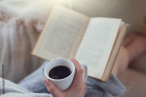 Relaxing with a good read. Closeup shot of a woman relaxing with a book and cup of coffee.