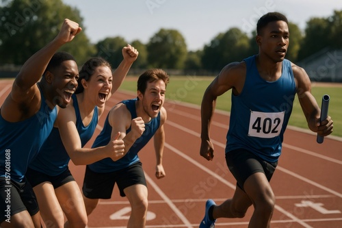 Relay team members celebrating enthusiastically as a teammate sprints on a track, showcasing teamwork and athletic success