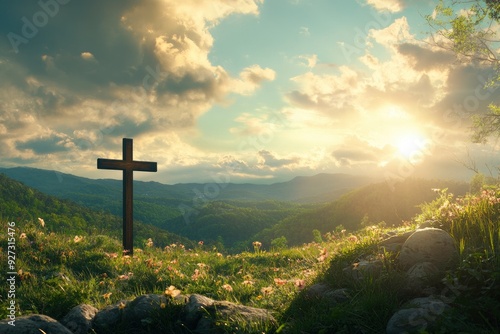 Religious representation with cross and nature landscape background , ai
