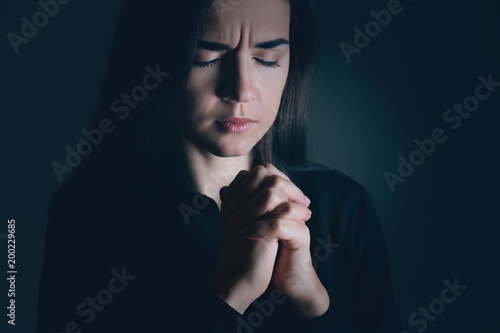 Religious young woman praying on dark background
