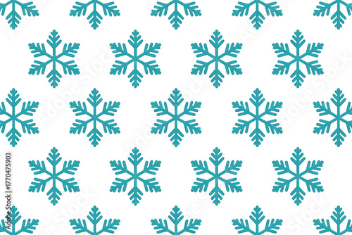 Repeating teal snowflakes adorn a white background, creating a wintry, patterned design.