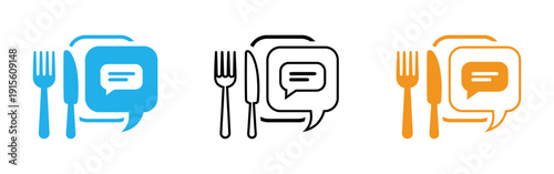 eatery, conversation, icon, utensil, plate, speech bubble, fork, knife, blue, black, orange, colourful, simple, illustration, symbol, communication, dining, food, talk, dialogue, eating, three, speech, bubble, colours