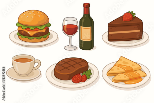 Restaurant food and drink set. Cartoon vector icon collection of delicious meals. Burger, steak, chocolate cake, crepes, coffee, red wine. Isolated elements for menu or dinner.