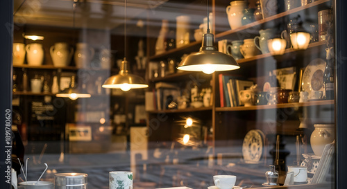 shop, window, display, shelf, pottery, ceramic, vase, book, interior, merchandise, collection, vintage, antique, decor, home, cafes, eatery, lighting, lamp, warm, cosy