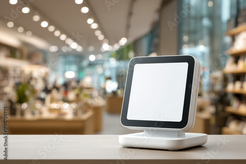 Retail payment POS terminal with blank white display on tidy counter, checkout concept