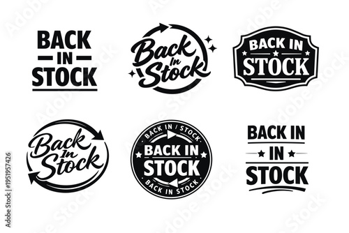 retro, back, stock, label, typography, vintage, collection, design, black, white, classic, emblem, badge, insignia, merchandise, announcement, availability, circular, angular, decorative, graphic, stylish, marketing, product, retail, commerce, business, lettering, art, print, promotional, advertisement, branding, symbol, set, arrow, star, frame, bold, text, illustration, logotype, concept, monochrome