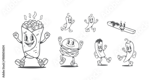 food, fast, vintage, retro, cartoon, mascot, character, 1930s, 30s, old, school, classic, animation, burger, hamburger, chili, pepper, spicey, fries, snack, eatery, branding, logotype, vector, illustration, black, white, monochrome, line, art, hand, drawn, doodle, funny, happy, cheerful, smiling, dancing, walking, nostalgia, nostalgic, take-away, junk, street, comic, ink, drawing, isolated, set