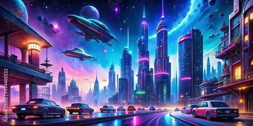 city landscape, neon light, night sky, star, futuristic, architecture, technology, urban, skyline, science fiction, imaginative, dreamlike, digital artwork, transportation, 1980s, fantasy, illumination, glowing, landscape, night scene, creative, innovation, surreal, metropolis, electric, culture, aesthetic, atmosphere, dynamic, modern, artistic, colourful, unique, visual, dreamscape, nostalgia, city landscape
