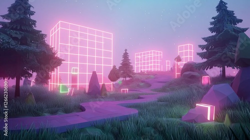 80s, 90s, neon, futuristic, landscape, nature, geometric, grid, tree, grass, path, rock, purple, pink, vibrant, colours, digital artwork, fantasy, abstract, environment, design, illustration, texture, artwork, scene, background