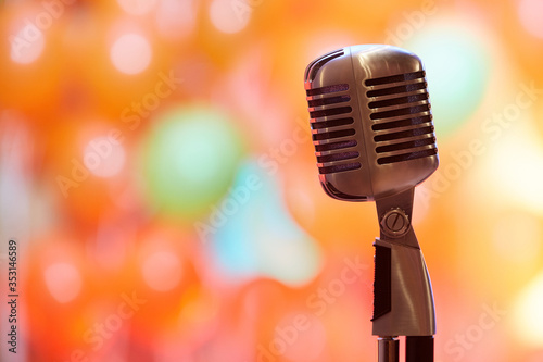 Retro microphone on orange background of restaurant lights