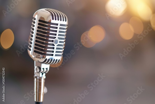 Retro microphone with a blurred background and warm bokeh lights creating a vintage music scene ambience