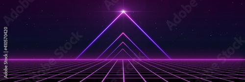 Retro style 80s Sci-Fi Background Futuristic with laser grid landscape. Digital cyber surface style of the 1980`s. 3D illustration. For banner
